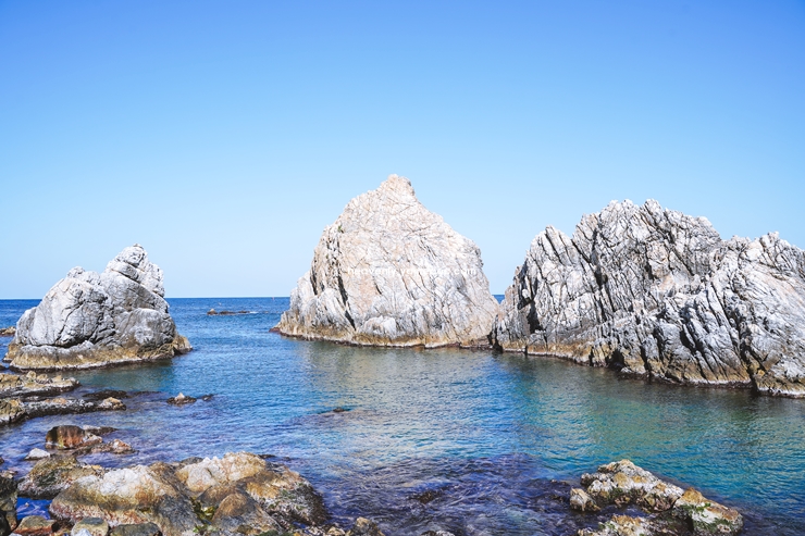 해안선을 따라 걷다 보면 바위들이 독특한 형상으로 자리 잡고 있어 눈길을 끕니다. 항구에 정박해 있는 배들과 바다 위에 떠 있는 부표들이 조화를 이루며 잔잔한 분위기를 만들어냅니다.