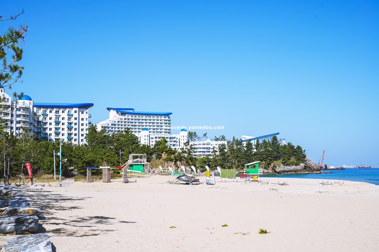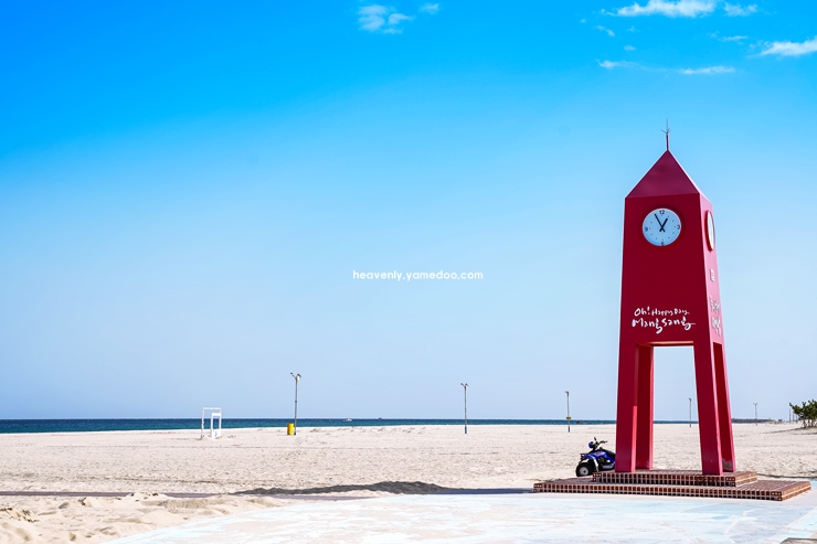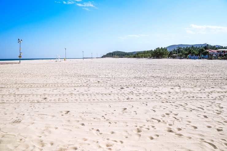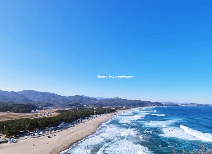 모래사장을 걷는 것만으로도 기분이 좋아지고 파도 소리가 마음을 차분하게 만들어줍니다. 근처에 자리한 소나무 숲이 해변과 어우러져 자연 속에서의 여유를 더해줍니다.