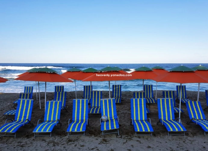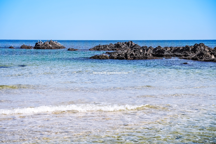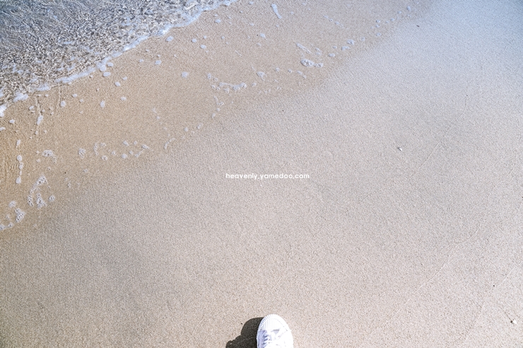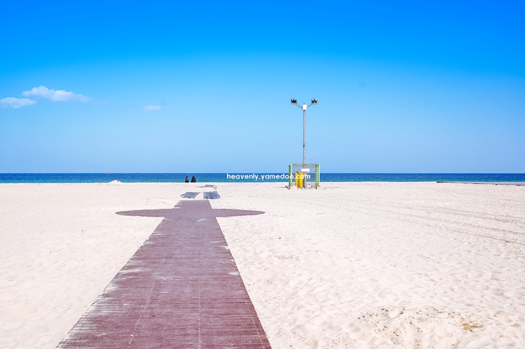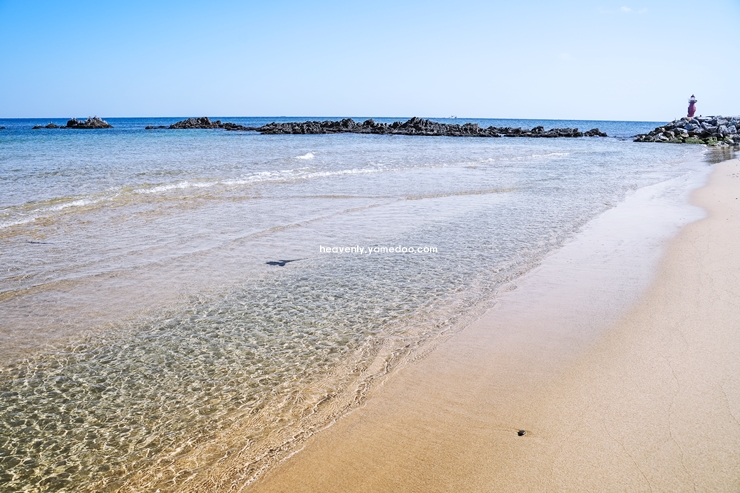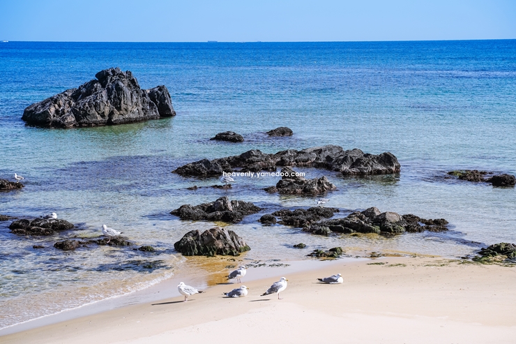 해수욕장 근처에는 아기자기한 카페들이 있어 차 한 잔하며 바다를 감상하기에도 좋습니다. 모래사장은 고운 편이라 맨발로 걷기에 부담이 없습니다.