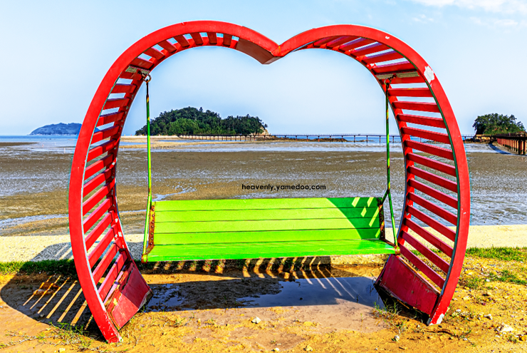 전망대에 올라서면 하트 모양이 선명하게 보이며, 밀물과 썰물에 따라 변하는 모습이 신비롭게 다가옵니다. 물이 빠진 시간대에는 가까이 내려가 모래사장을 걸을 수 있어 더욱 특별한 경험이 됩니다.