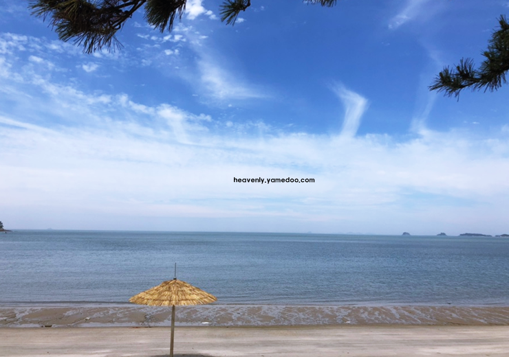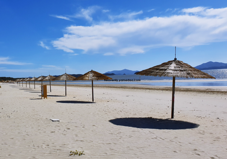 바닷물은 맑고 푸르며, 밀물과 썰물에 따라 변화하는 해변의 모습이 색다른 느낌을 줍니다. 해수욕장 주변에는 소나무 숲이 자리하고 있어 자연스럽게 그늘이 생겨 여름철에도 시원하게 머물 수 있습니다.