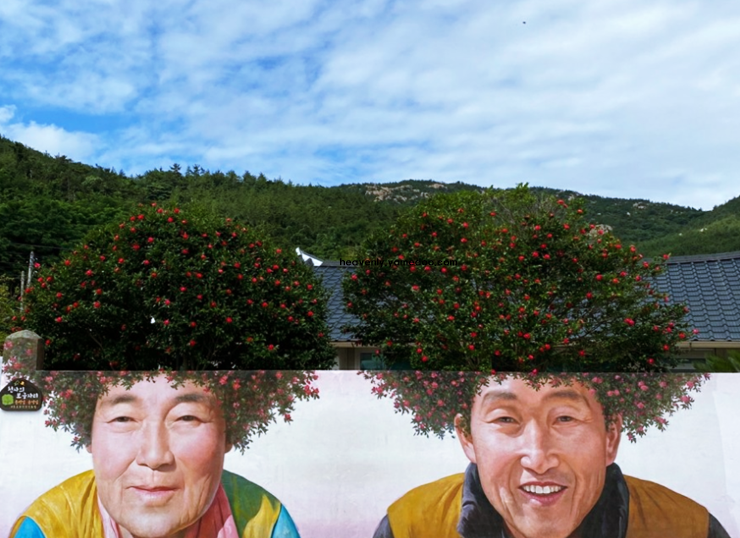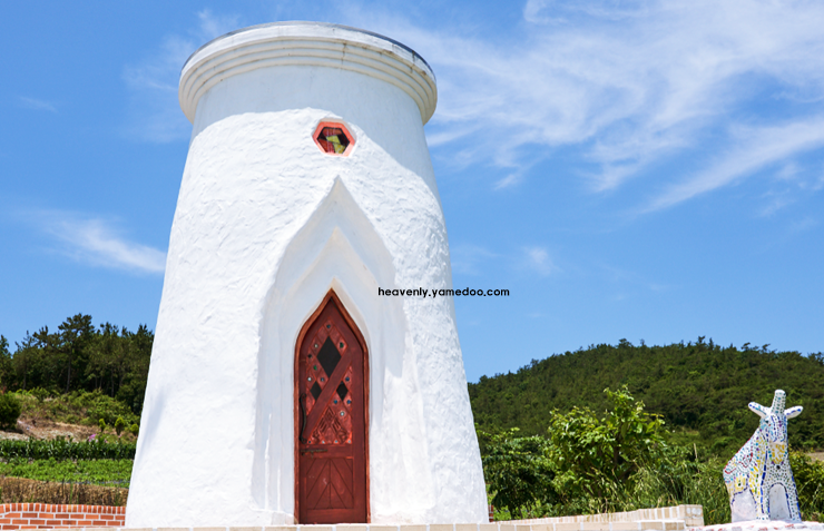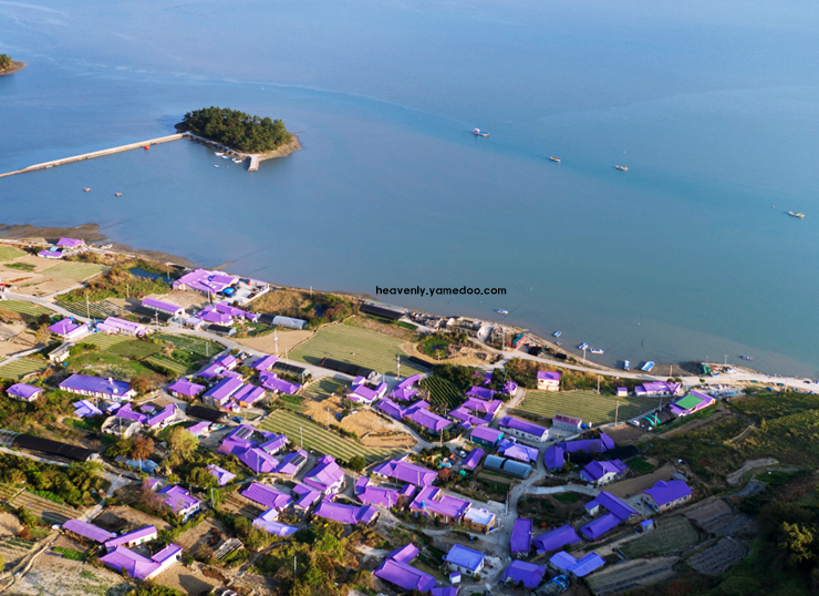 섬 안으로 들어서면 보라색 지붕의 가옥들과 라벤더, 자귀나무 같은 보랏빛 식물들이 조화를 이루고 있습니다. 마을 골목마다 아기자기한 벽화와 조형물이 있어 천천히 걸으며 둘러보기 좋습니다.