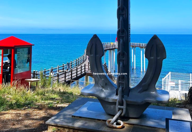 나무 데크를 따라 전망대에 오르면 탁 트인 동해가 펼쳐지면서 시원한 바닷바람이 온몸을 감쌉니다. 전망대 자체가 닻 모양을 하고 있어 바다와 어우러진 모습이 인상적이었고, 끝에 서면 마치 물 위에 떠 있는 듯한 기분이 들었습니다. 유리 바닥이 설치된 구간에서는 아래로 바다가 보여 아찔하면서도 특별한 경험을 할 수 있었습니다.