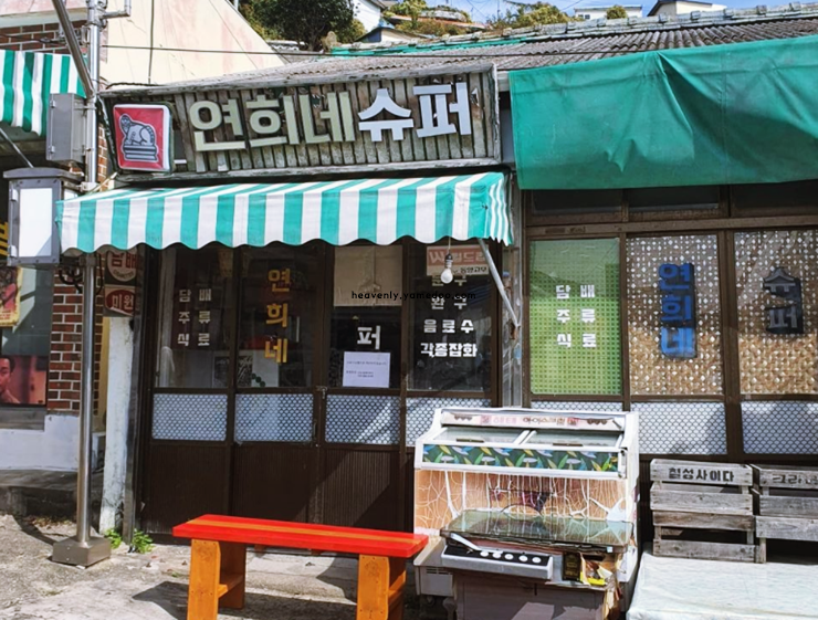 연희네슈퍼 앞에 도착하니 작고 아담한 외관이 골목 풍경 속에 자연스럽게 녹아 있\는 목포 가볼만한곳 베스트10 입니다. 간판은 손글씨 느낌 그대로였고, 벽에는 드라마 촬영 당시의 장면이 붙어 있었습니다.