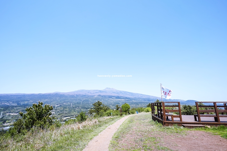 정상에는 나무 벤치가 하나 놓여 있었고, 그 위에 앉아 바라본 풍경은 말로 다 표현하기 어려웠습니다. 아래로는 푸른 목장과 귤밭이 보였고, 멀리 한라산 능선도 흐릿하게 이어졌습니다.