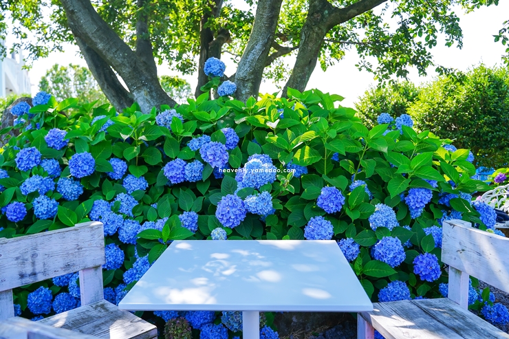 마노르블랑에 들어서자 수국이 활짝 핀 정원이 가장 먼저 시선을 사로잡은 제주 가볼만한곳 베스트10 여행지입니다. 파스텔빛 수국들이 언덕을 따라 피어 있어 마치 꽃길 위를 걷는 듯한 기분이 들었습니다.
