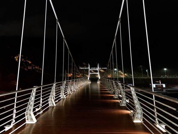양쪽으로 펼쳐진 풍경은 초록빛 산과 푸른 물이 어우러져 마음을 시원하게 해주었습니다. 출렁다리 중간쯤에 서면 사방이 탁 트여 있어 오래도록 머무르고 싶어졌습니다.