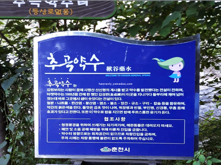 추곡약수에 도착하자 주변을 감싸는 나무들의 향과 함께 시원한 기운이 몸으로 스며든 춘천 가볼만한곳 입니다. 약수터로 가는 길은 조용하고 한적해서 천천히 걷기에 참 좋았습니다.