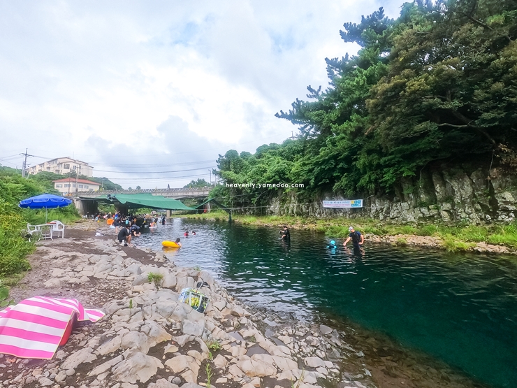 강정천에 도착하니 투명한 물줄기가 햇빛에 반사되어 반짝이며 반겨주었습니다. 발끝을 담그자마자 퍼지는 시원함에 한여름 더위가 순식간에 사라지는 듯했습니다.