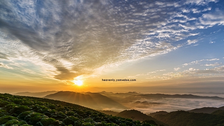 부드럽게 이어지는 산등성이 위로 바람이 지나가고, 풍력발전기가 돌아가는 소리가 멀리서 은은하게 들려왔습니다. 이른 새벽에 오르면 운해가 산허리를 감싸며 떠오르는 햇살과 어우러지는 장면은 그야말로 황홀함 그 자체였어요.