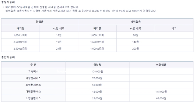 앞의 표로 보면 쉽게 알 수 있습니다. 승용자동차의 경우 배기량에 CC당세액을 곱하여 산출한 세액을 년세액으로 합니다.
