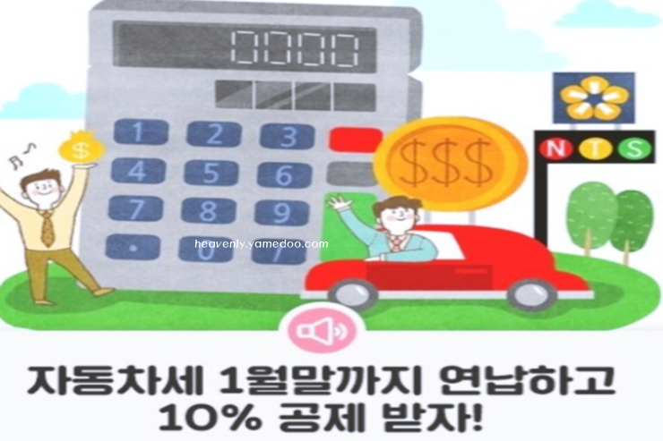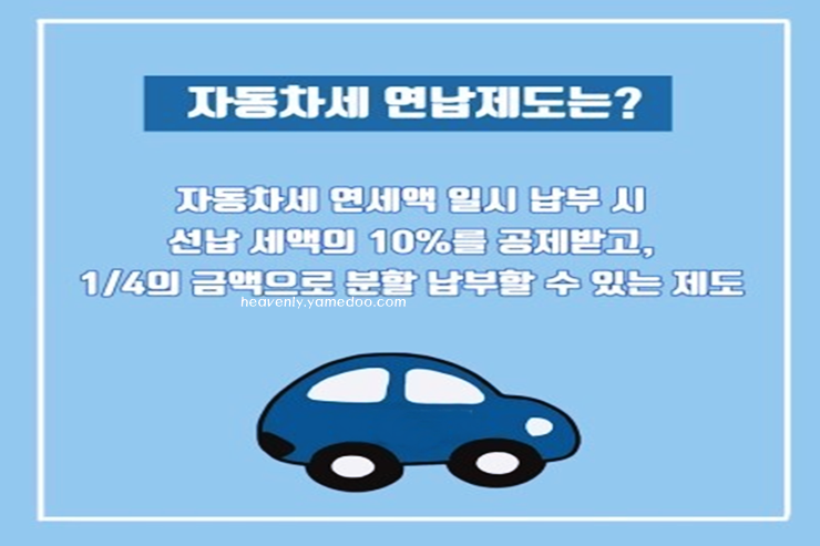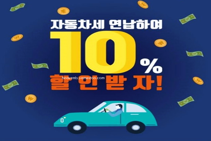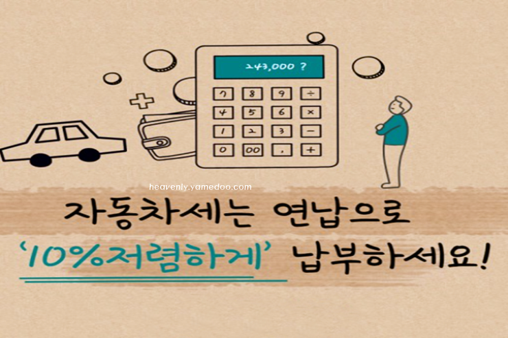 그리고 자동차세 연납신청을 딱 한번 하시면됩니다. 1월에 자동차세를 연납한 납세자는 다음연도 1월에 관할 지자체에서 10% 공제된 고지서를 보내주기 때문에 따로 신청할 필요가 없겠습니다.