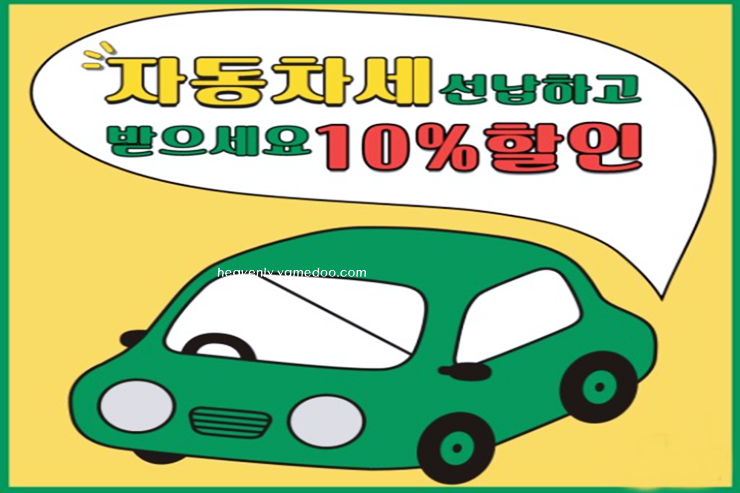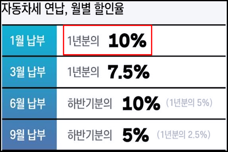 대게 보면 많은 분들이 6월, 12월 두 번에 걸쳐 자동차세를 납부를 합니다. 그런데 만약 자동차세를 두 번이 아닌 1월에 한꺼번에 납부를 하게 되면 10%정도의 공제율혜택을 받을 수 있습니다. 쉽게 말해 1년 자동차세 세금 100만원의 차량이 있습니다. 그런데 1월에 자동차세 납부로 인해 딱 90만원만 납부하면 된다는 것입니다.