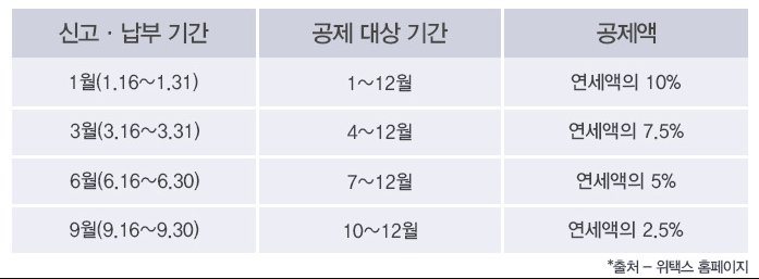 1월(1월 16일부터 1월 31일까지) 신고납부하는 경우 연세액의 공제율 10%