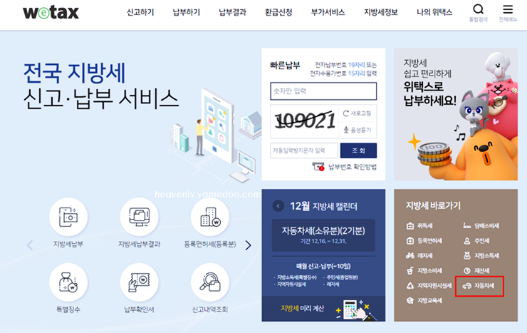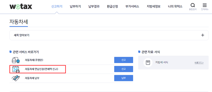 위택스 wetax.go.kr 접속 - 지방세 바로가기 우측하단 - 자동차세연납신청클릭( 회원인 경우) 위택스의 좋은점 따로 가입 필요없이 비회원도 위 경로로 동일하게 접속하여 신청이 가능합니다.