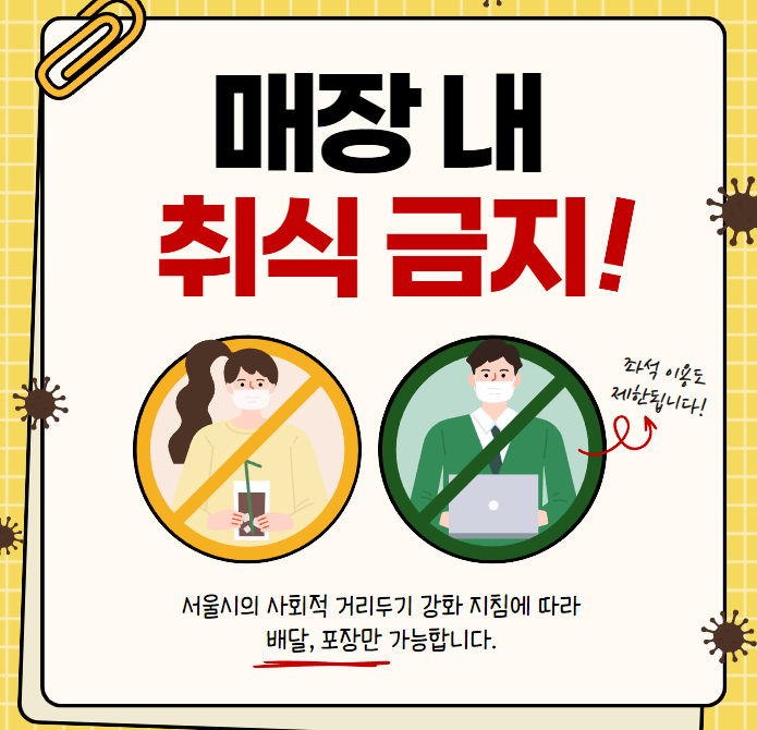 또한 우리가 일상생활을 하는데 가장 중요한 곳 식당과 카페는 백신 접종완료자만 이용이 가능하겠습니다. 미접종자는 혼자 이용하거나 포장 및 배달만 가능하겠습니다.